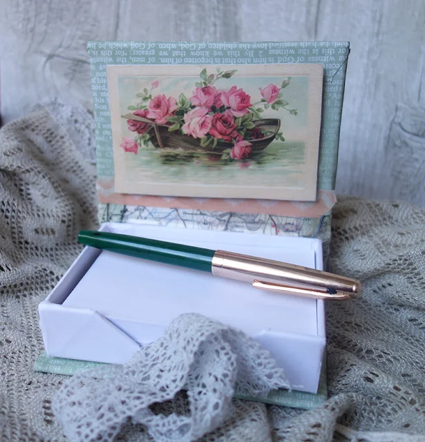 Styczeń to też czas święta babci i dziadka. Poniżej komplet: pudełeczko na notatki i kartka, wykonane dla "seniorki". W środku pudełeczka romantyczny obrazek z kolekcji 'Sercem Malowane'