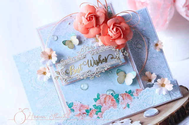 This card is created using 'Love of my life' collection. It is a soft collection filled with lace patterns and pastel colours perfect for wedding projects.