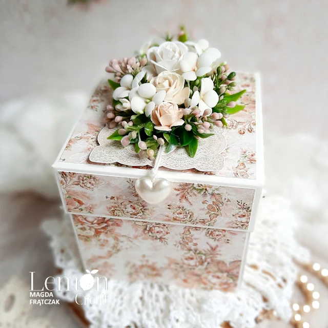Magdalena podeszła do tematu klasycznie i elegancko, przygotowując różane pudełko eksplodujące - exploding box, które skrywa w sobie mnóstwo typowo ślubnych symboli takich jak para młoda, czy obrączki. Całość z lekką nutą vintage, którą znajdziesz w papierach z kolekcji Dom Róż Extra.