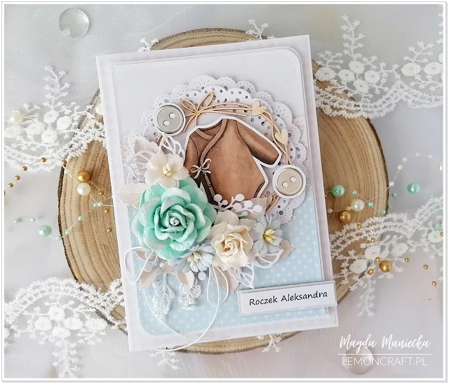 | Również z kolekcji Lemoncraft, które nie są kolekcjami dziecięcymi, wykonasz wspaniałe pamiątki pierwszych urodzin. Tutaj kartka bodziak wykonana z delikatnej, kwiatowej kolekcji LINEN STORY. |